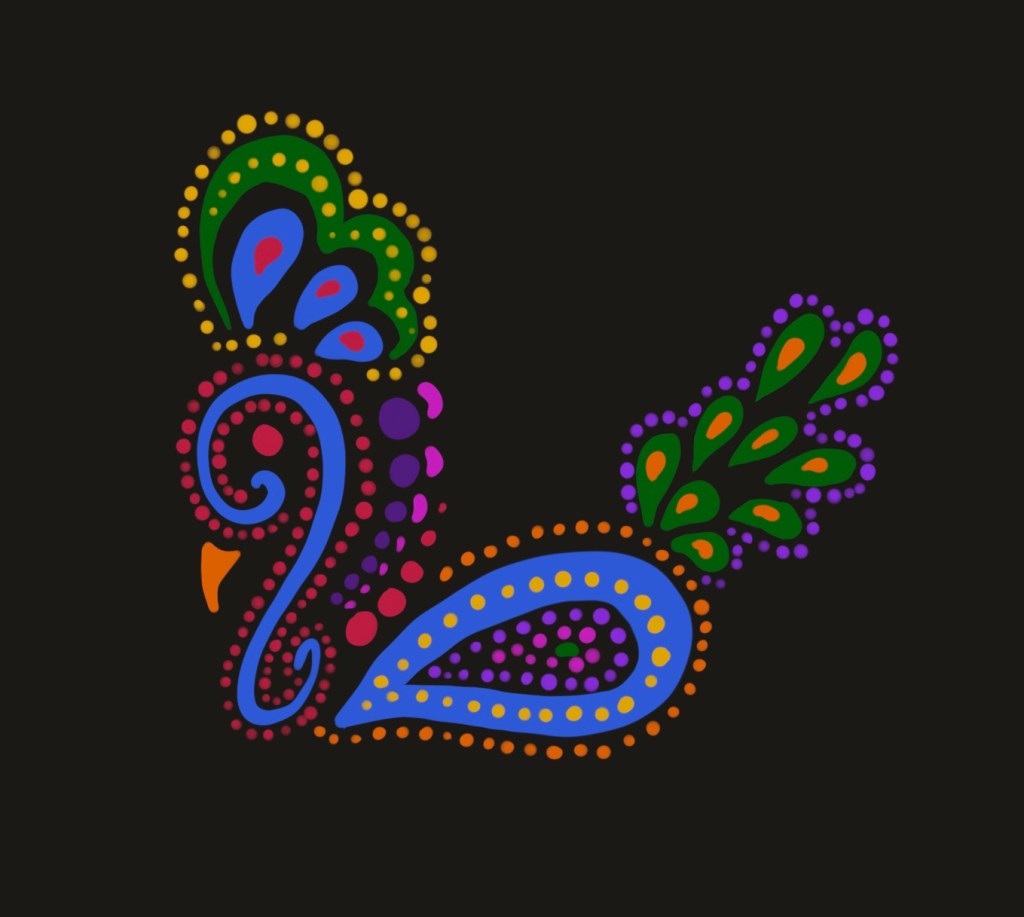 Hand-digital painting (ergo it isn’t neat) inspired by Mexican embroidery and aboriginal art. I just love the color combination, the authenticity of both arts.